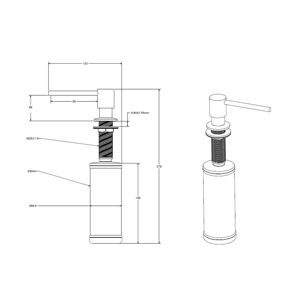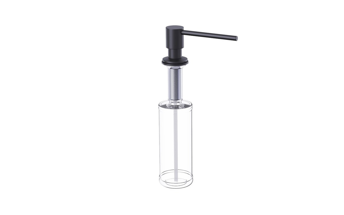 Distributeur de savon ou de détergent encastré en noir. La pompe est en laiton. Pour remplir le distributeur de savon ou de détergent, il suffit de retirer la pompe du distributeur et de la remettre en place, sans avoir à visser quoi que ce soit. Montage par perçage.