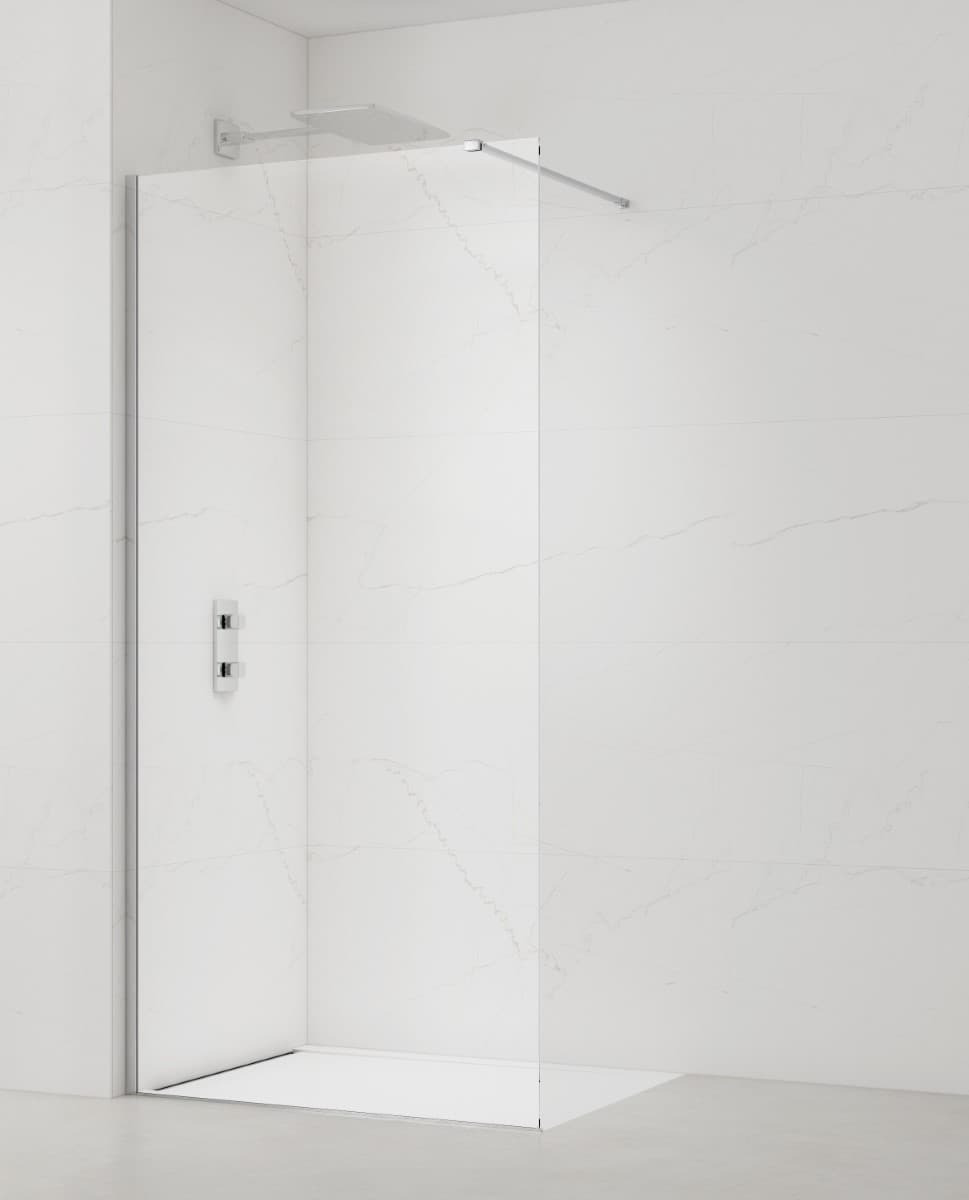 Son design épuré, renforcé par des profilés et un bras de fixation en chrome brillant, ajoute une touche de luxe et d'élégance à votre espace, parfait pour créer une douche à l'italienne spacieuse et lumineuse.