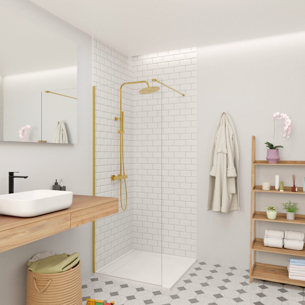 Équipée de profilés et d’un bras en or, cette paroi apporte une touche d’élégance et de sophistication à votre salle de bain, parfaite pour réaliser votre rêve de douche à l'italienne.