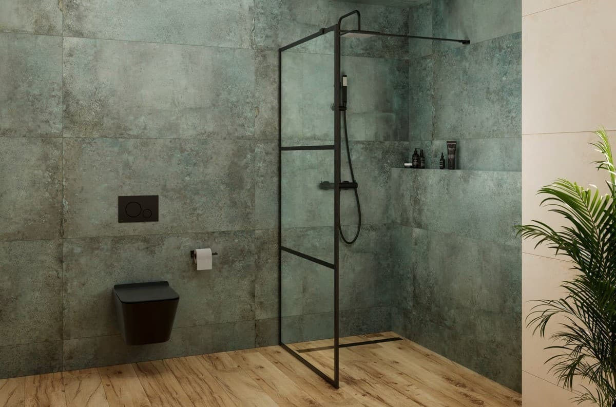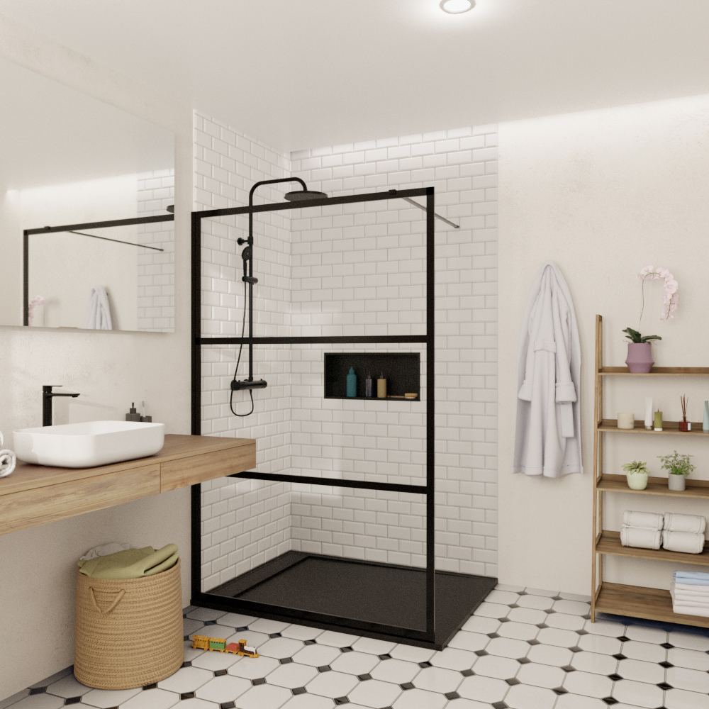 Caractéristiques de la paroi de douche Walk-In anticalcalcaire sérigraphié avec profilés et bras noir mat (SATBWI140CPPRC) :