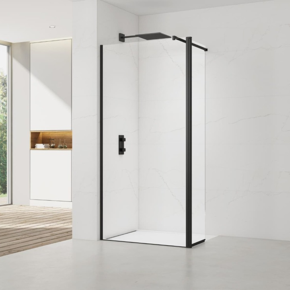 Cette paroi de douche de 120 et son retour cm, en verre Crystal Glass® de 8 mm d’épaisseur avec traitement anticalcaire, combine esthétisme et praticité. Le design épuré est sublimé par des profilés et un bras de fixation noir mat, ajoutant une touche de modernité et de luxe à votre espace. Idéale pour une douche à l'italienne, il créer une sensation d'espace et de luminosité, tout en garantissant une transparence durable grâce au traitement anticalcaire et à la qualité remarquable du verre Crystal Glass®.