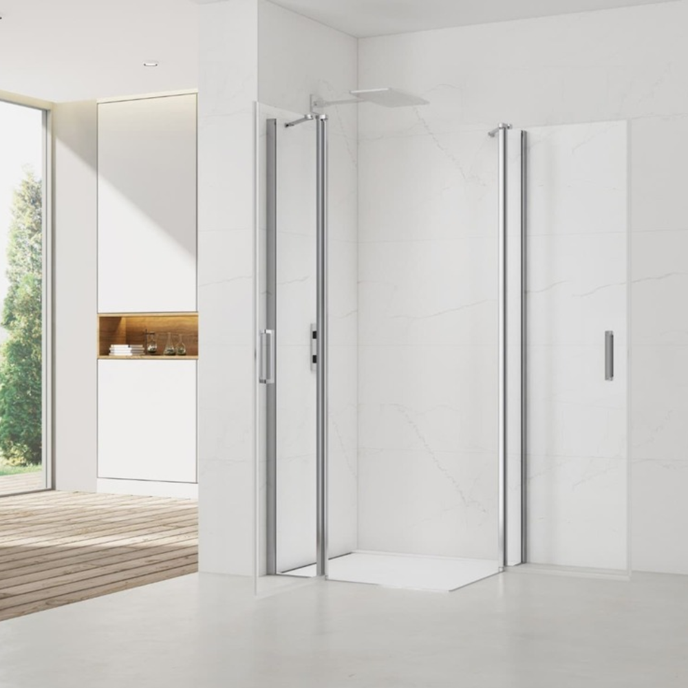 Swiss Aqua Technologies Fusion Portes de douche acces en angle pivotantes 90x90cm anticalcaire avec profilés chrome brillant (SATFUDP9090-SET)