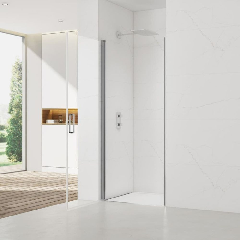 Caractéristiques de l'ensemble porte pivotante/paroi 100x100cm FUSION anticalcaire avec profilés chrome brillant (SATFUD100S100-SET) :