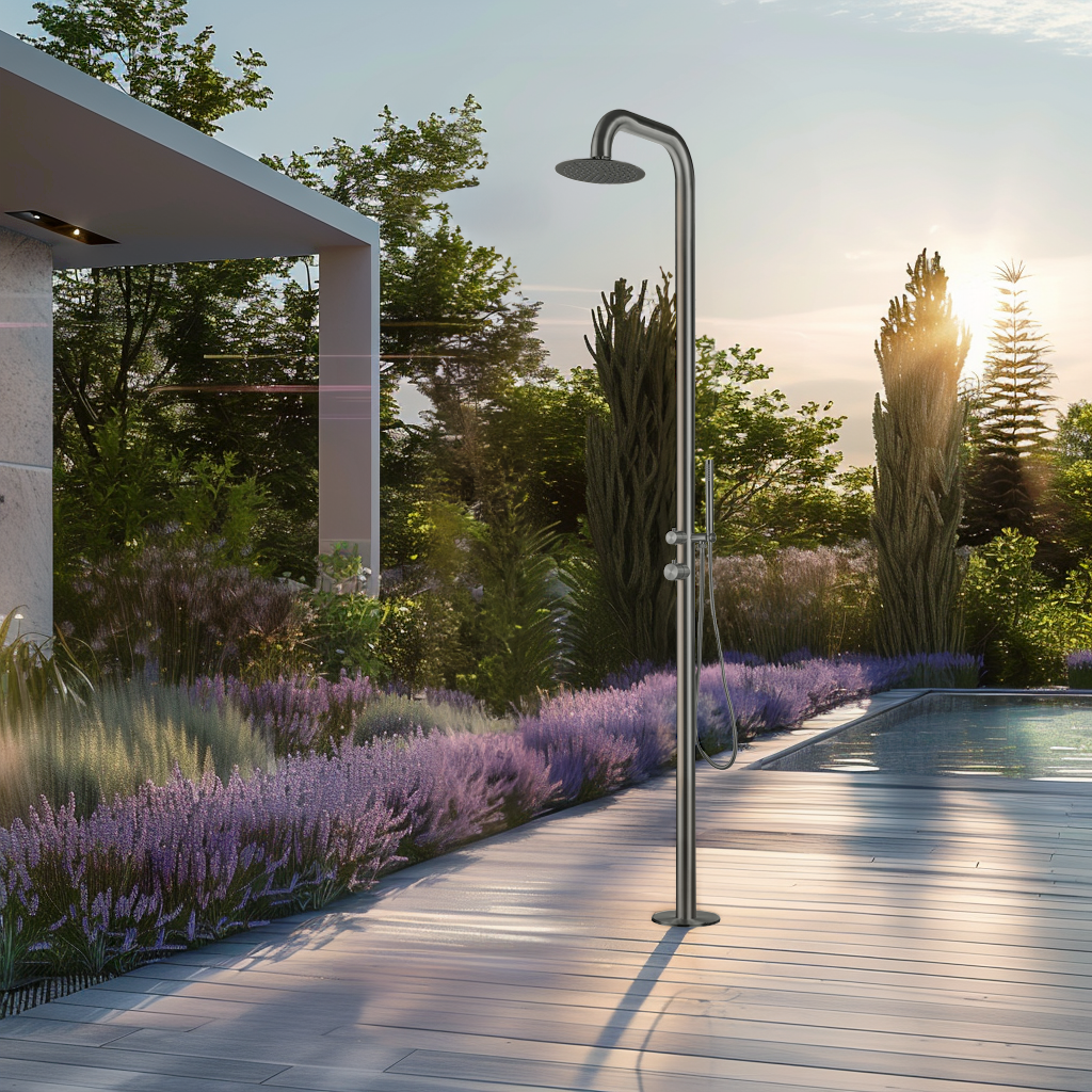 Caractéristiques de la douche extérieure en acier , eau chaude & froide, grande tête de douche, douchette à main, gun metal (NATUREL-3HGM)