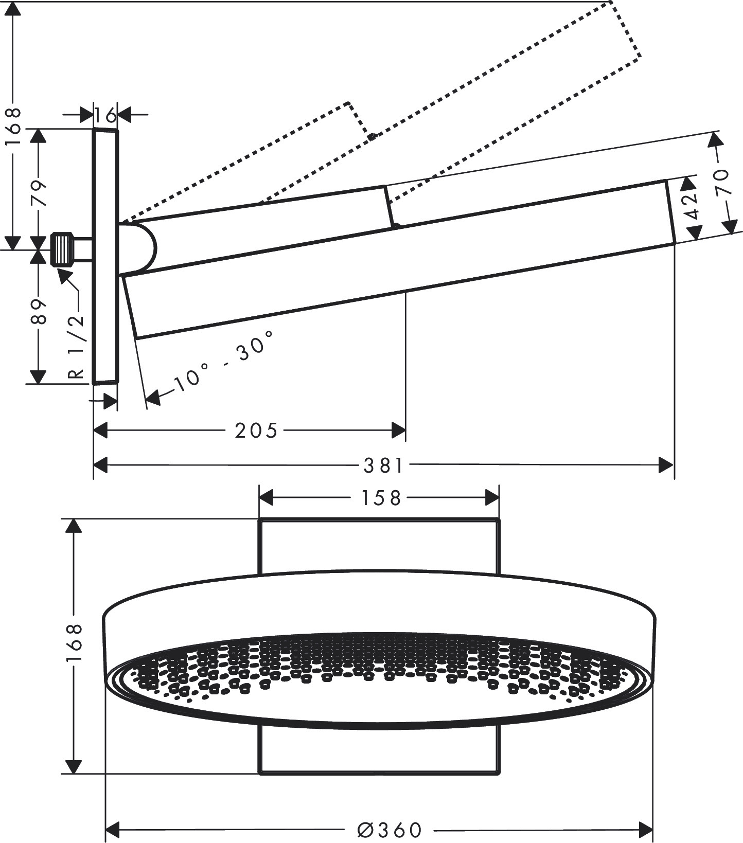 - Bras de douche inclinable verticalement de 10º à 30º