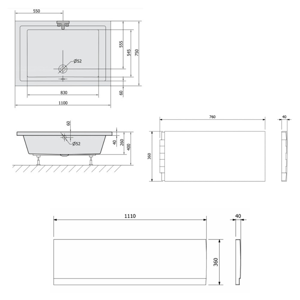 Deep 110x75x26 cm ensemble baignoire rectangulaire acrylique, sans pieds + tablier avant + tablier latéral, blanc (72883-SETD)