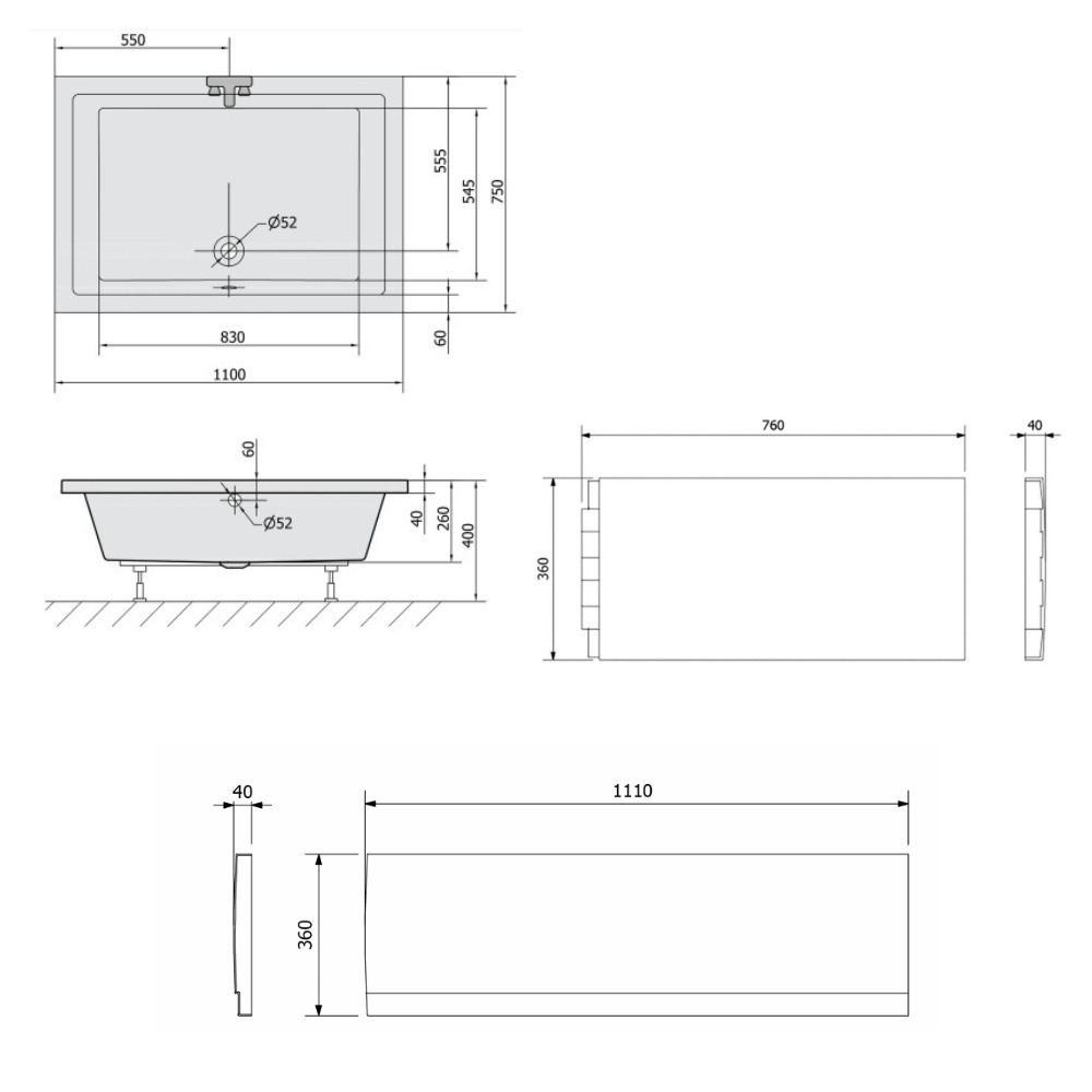 Caractéristiques de l'ensemble baignoire rectangulaire en acrylique 110x75x26 cm, sans pieds + tablier avant orientation gauche + tablier latéral orientation, Polysan Deep, blanc (72883-SETG) :