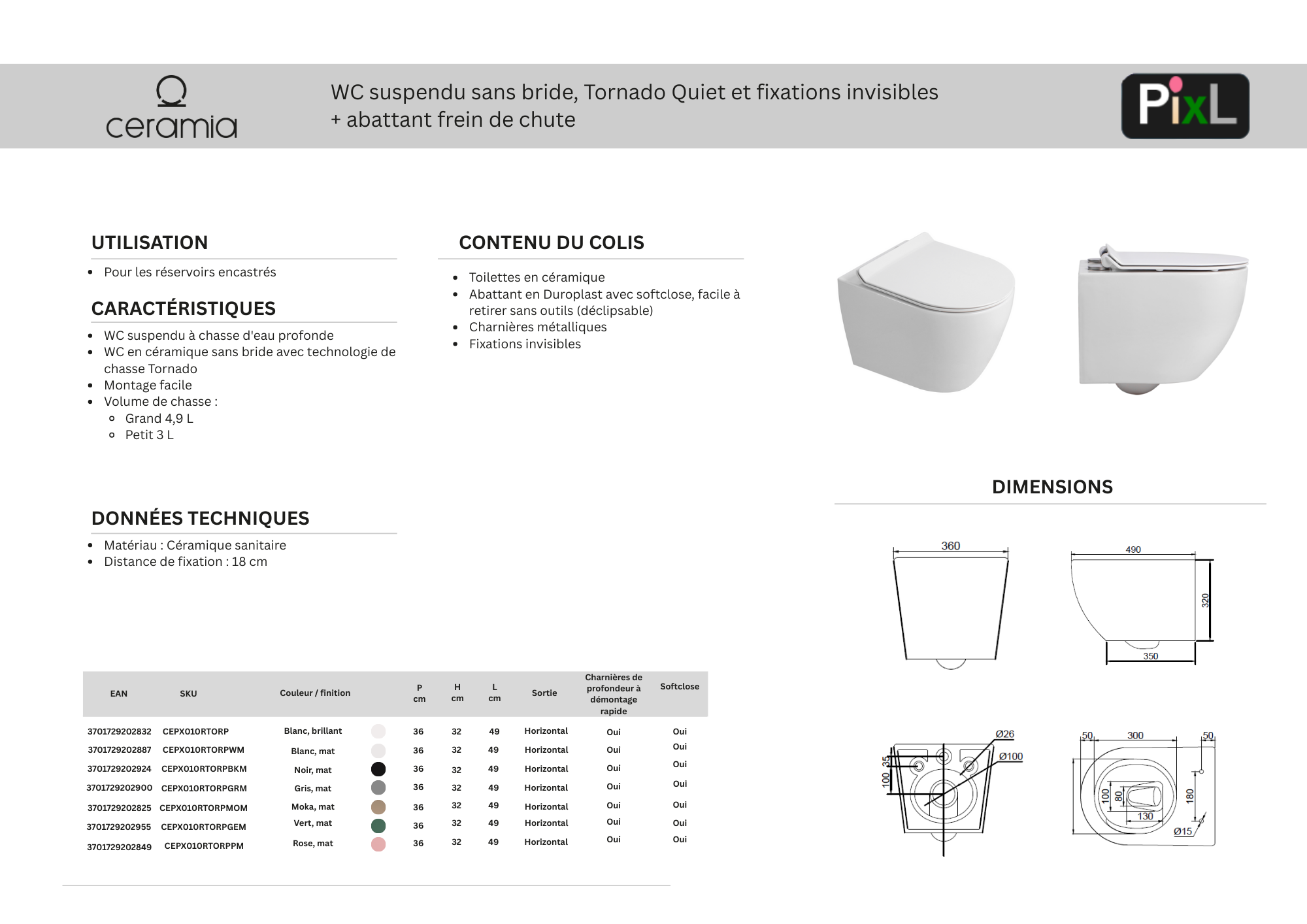 PixL Caractéristiques de la cuvette suspendue en céramique sans bride Tornado Quiet et fixations invisibles + abattant frein de chute, Ceramia PixL, vert mat (CEPX010RTORPGEM) :