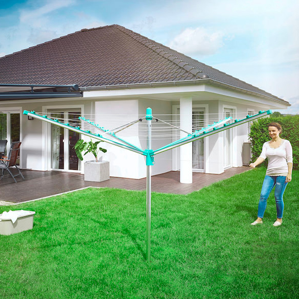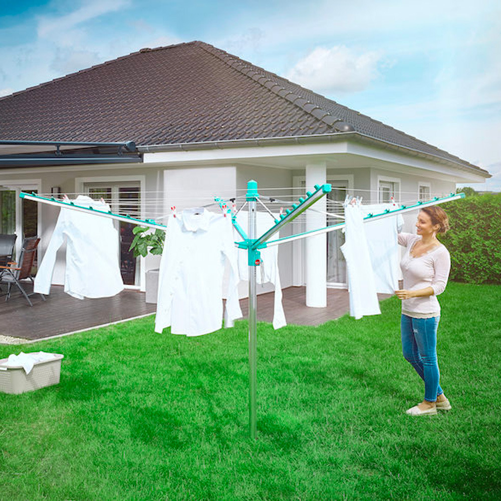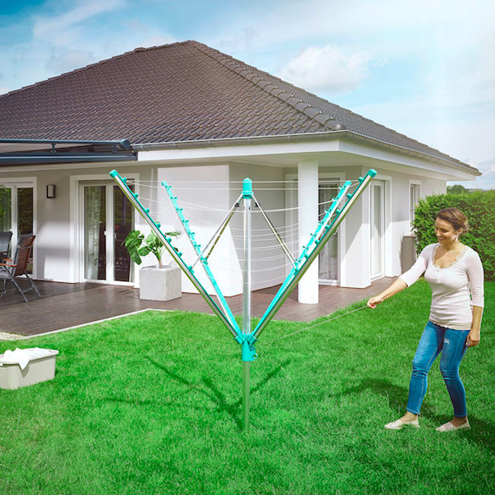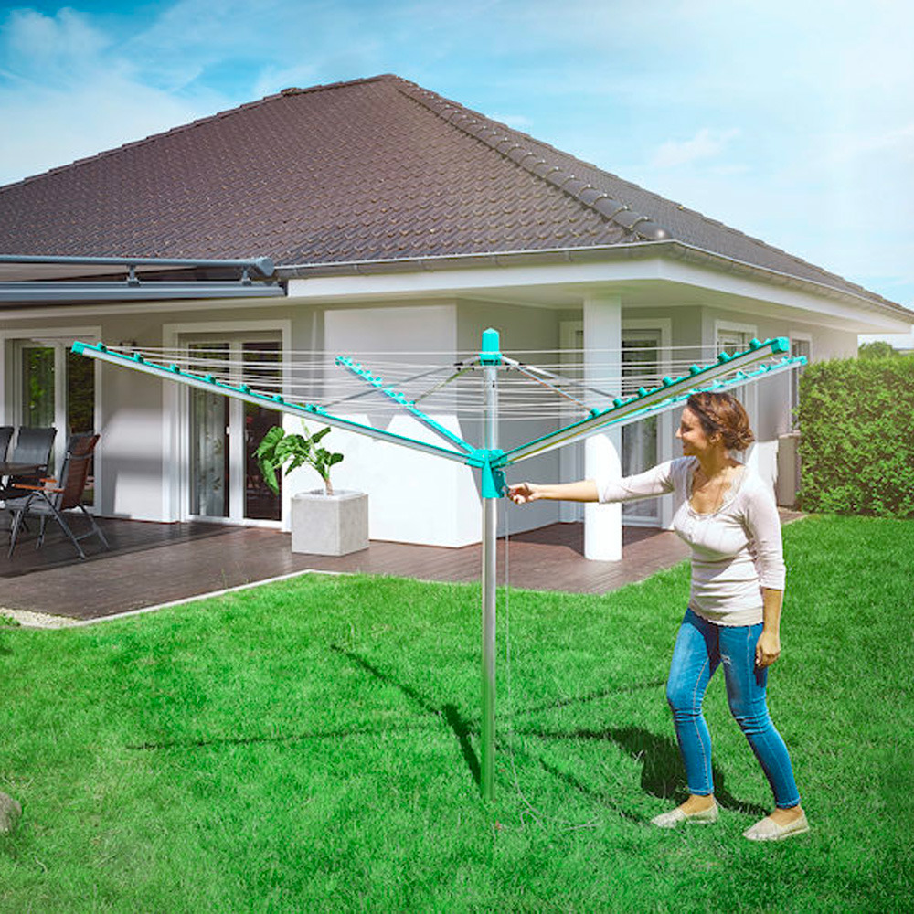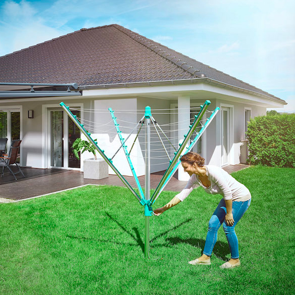 • Séchoir parapluie avec système de rétractation automatique des fils pour des fils toujours propres et un linge éclatant sans tache.