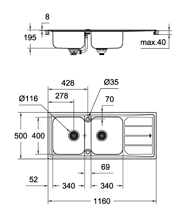 Grohe K500 Evier en acier inoxydable avec égouttoir, Inox