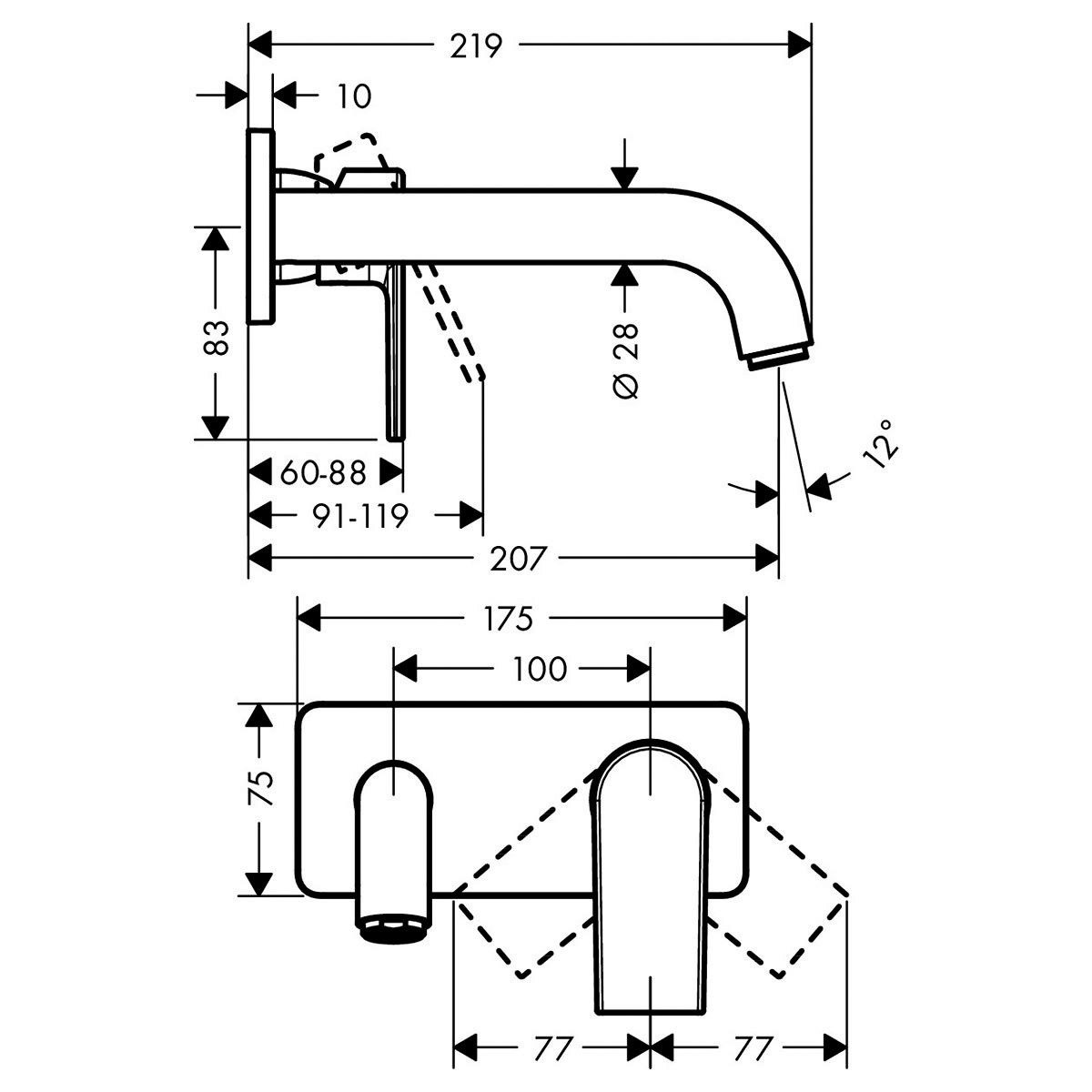Caractéristiques du Mitigeur de lavabo encastré mural, 2 sorties, bec 207 mm, Noir mat, Hansgrohe Vernis Shape (71578670) :
