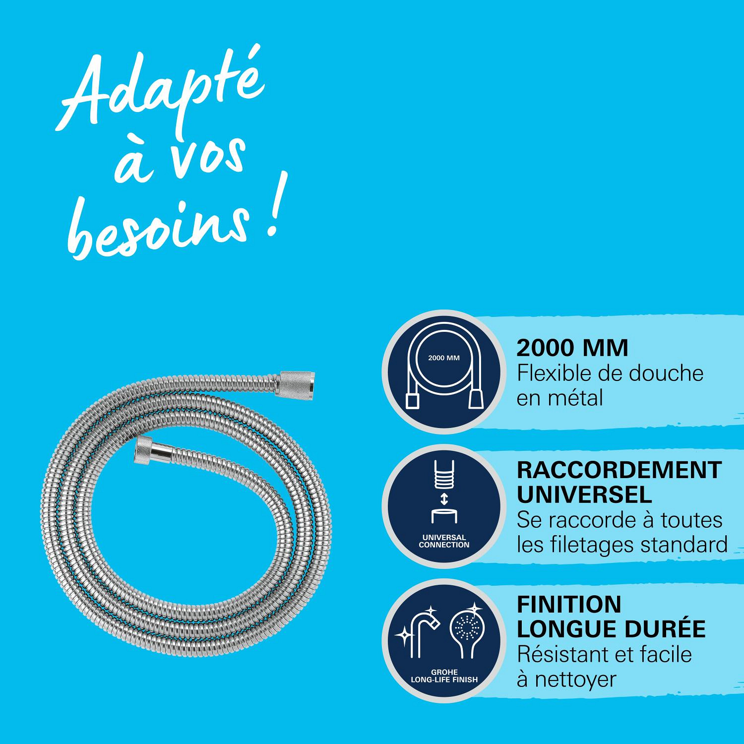 Caractéristiques du flexible de douche en métal 2000mm, chrome Grohe VitalioFlex Metal (G22107000) :