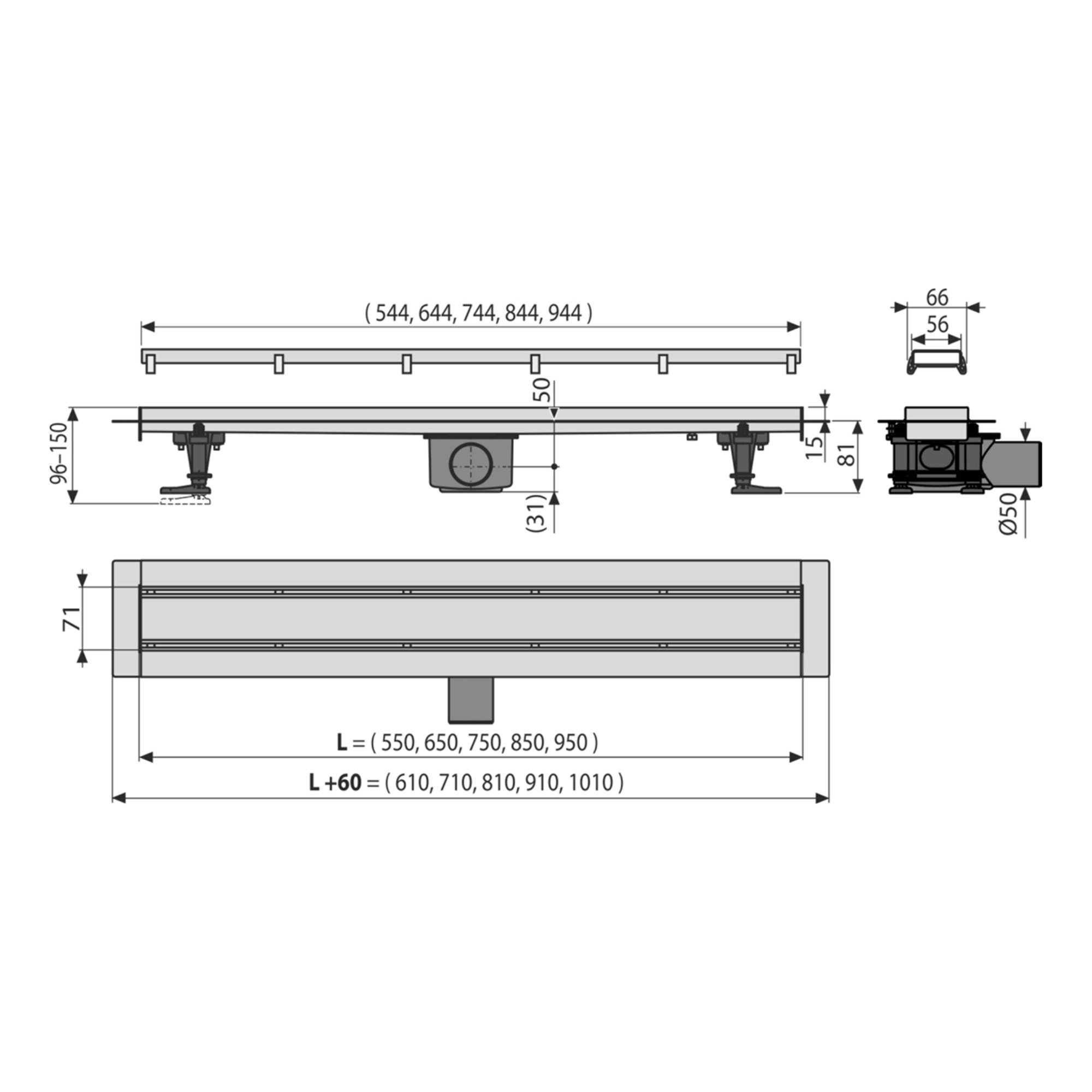 Caractéristiques du Caniveau de douche Fit and go avec grille double face, acier inoxydable ou revêtement à personnaliser Alca (APZ13-DOUBLE9-550) :
