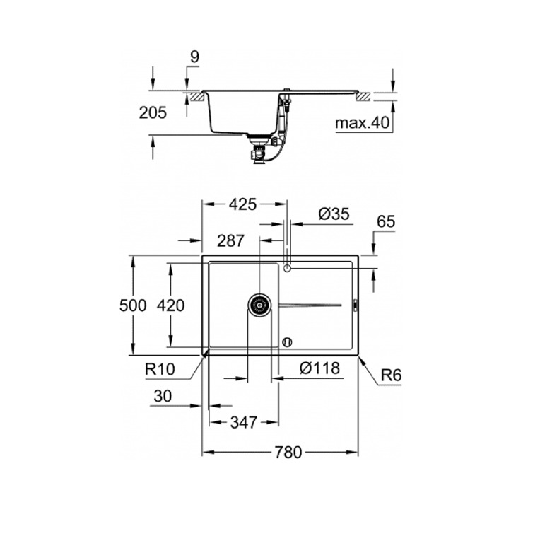 Caractéristiques du Set Evier K400 en quartz composite avec égouttoir réversible 780x500 mm, Gris granite + Mitigeur monocommande, Grohe (31639AT0-C5) :