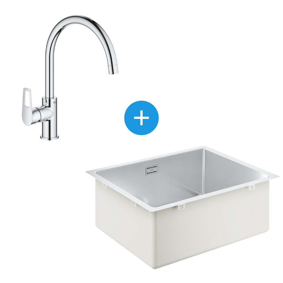 Grohe Kit Evier de cuisine K700 sous-plan 540x440mm Acier inoxydable + Mitigeur Bauloop Col de cygne, Chrome (31574SD1-SET1)