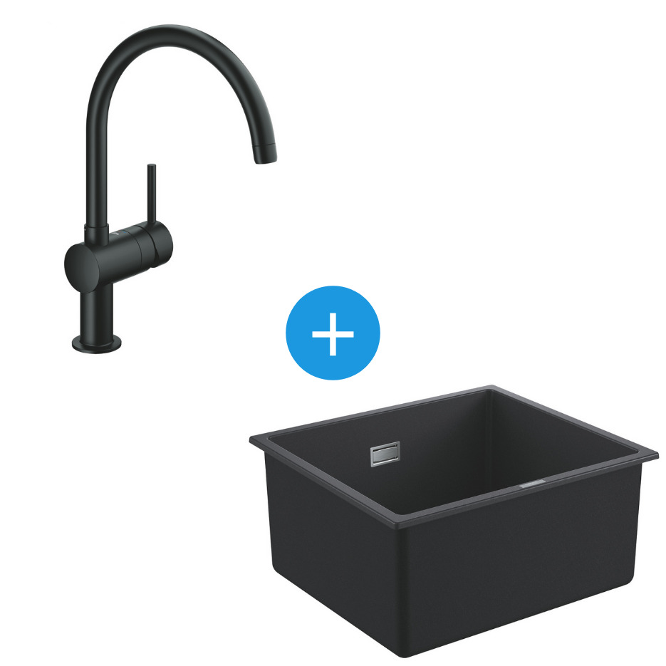 Grohe Kit Evier Quartz Noir Granite K700 417 x 366mm + Mitigeur Minta Noir col de cygne pivotant à 360° (31653AP0-SET6)