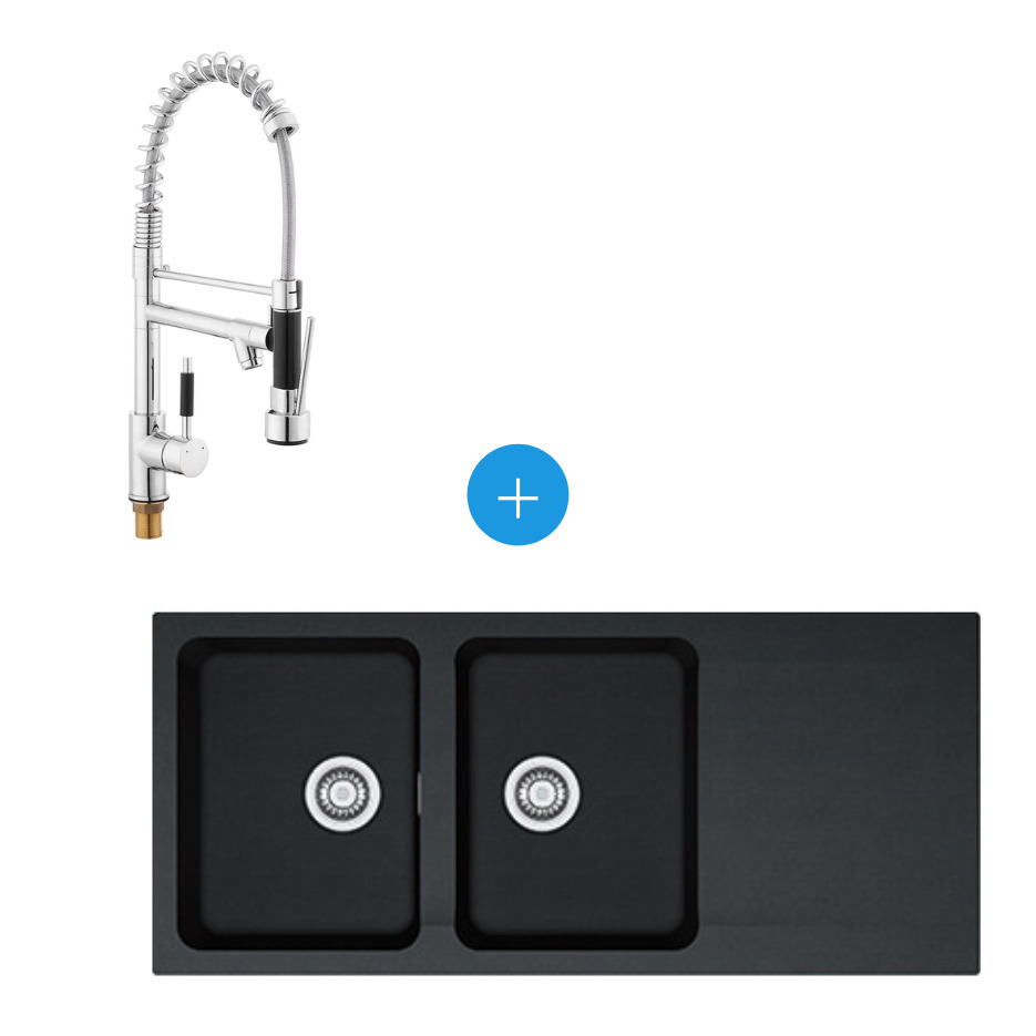 Laissez-vous séduire par ce Kit évier Orion OID 621 en Tectonite, double bac, Carbone + Mitigeur SAT Semi-Pro, 2 jets.