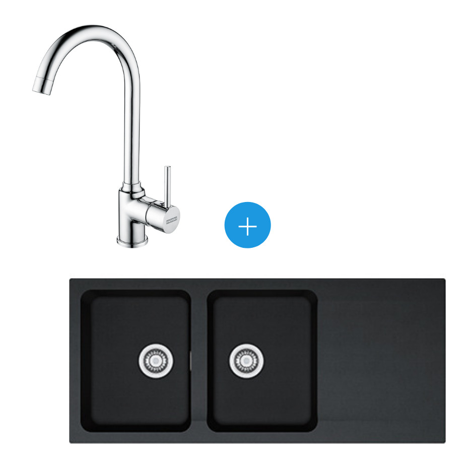 Laissez-vous séduire par ce Kit évier Orion OID 621, double bac, Carbone + Mitigeur Pola, col de cygne, Chrome (114.0276.028-POLA).