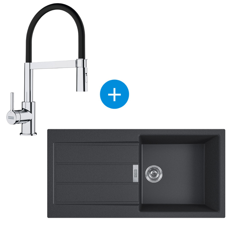 Franke Sirius Evier à encastrer 100×50cm 1 bac avec égouttoir, Noir + Mitigeur 205x410mm semi-pro, douchette extractible, Chrome/Noir