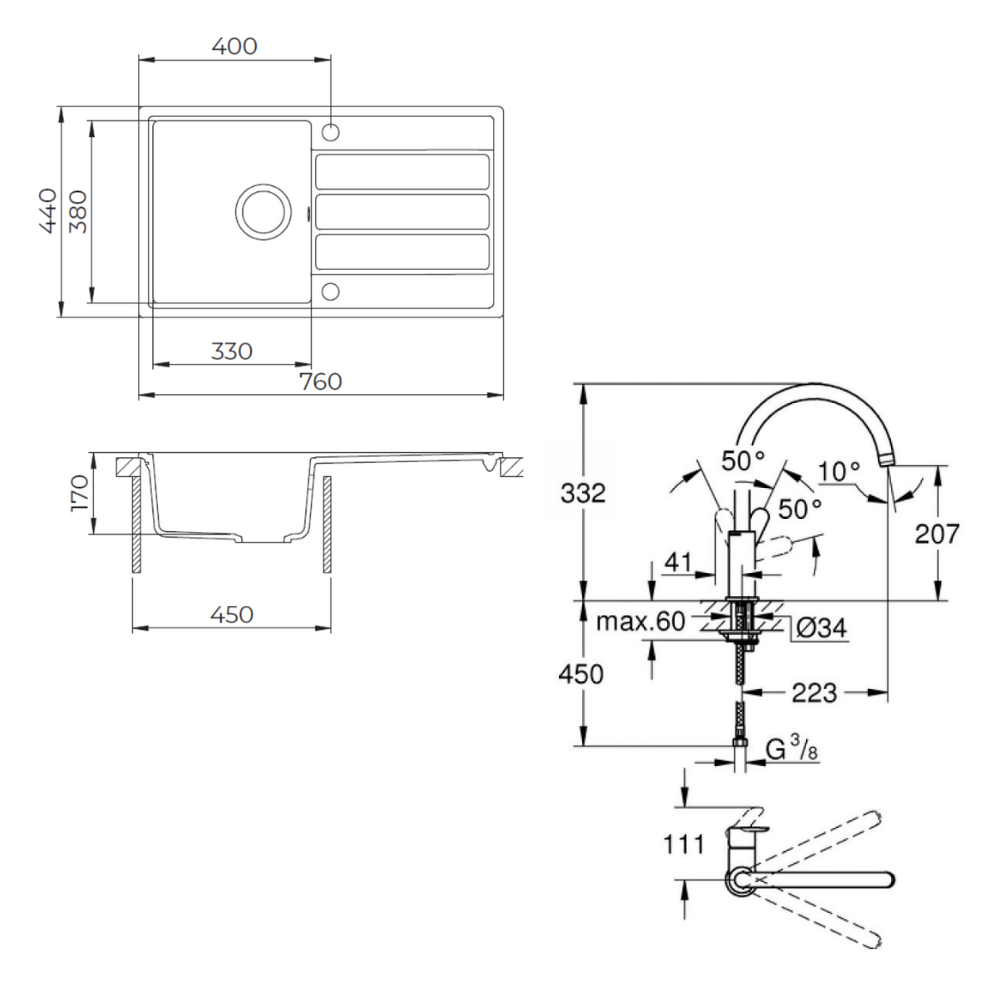 Caractéristiques de l'évier 76x44 cm avec égouttoir réversible en granite à encastrer + mitigeur monocommande, Swiss Aqua Technologies (SAT), jasmin (SATSINKGE3J-SET) :