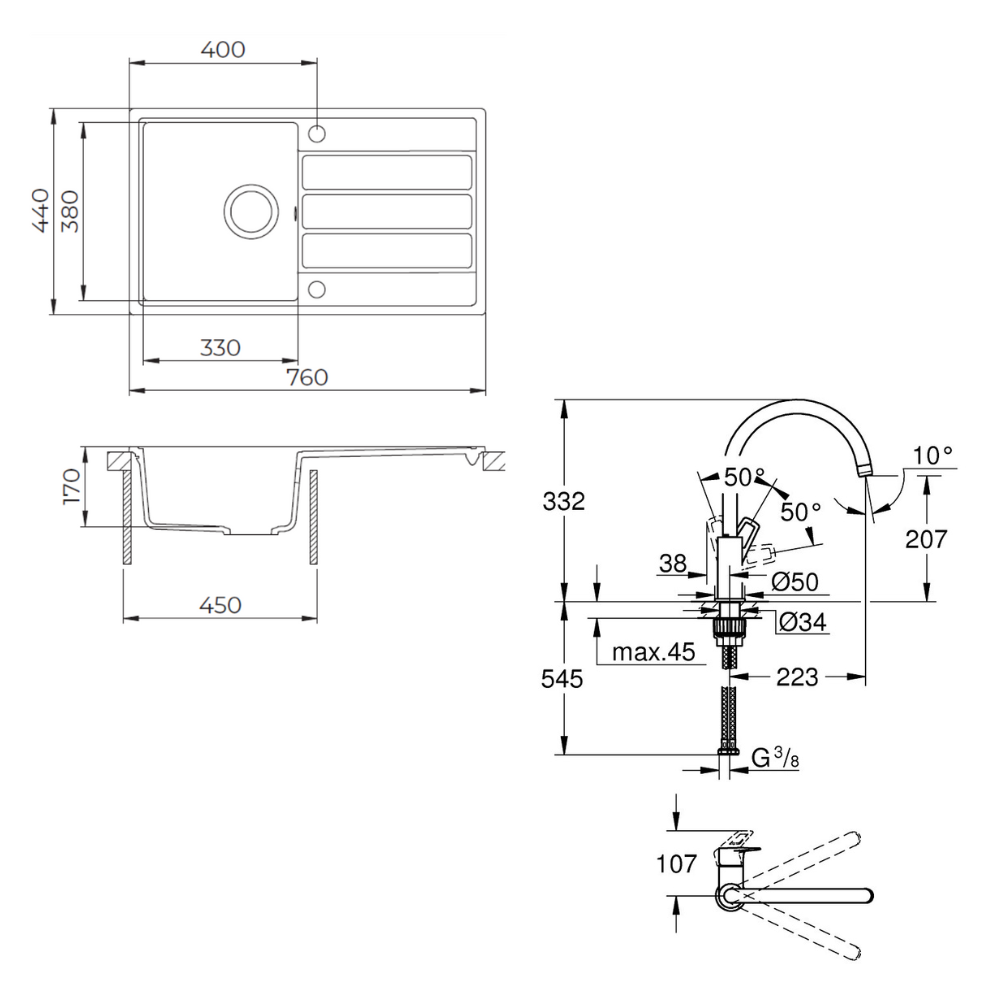 Caractéristiques de l'évier 76x44 cm avec égouttoir réversible en granite à encastrer + mitigeur monocommande, Swiss Aqua Technologies (SAT), blanc (SATSINKGE3W-SET) :