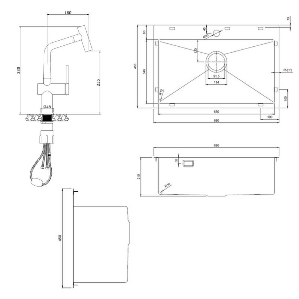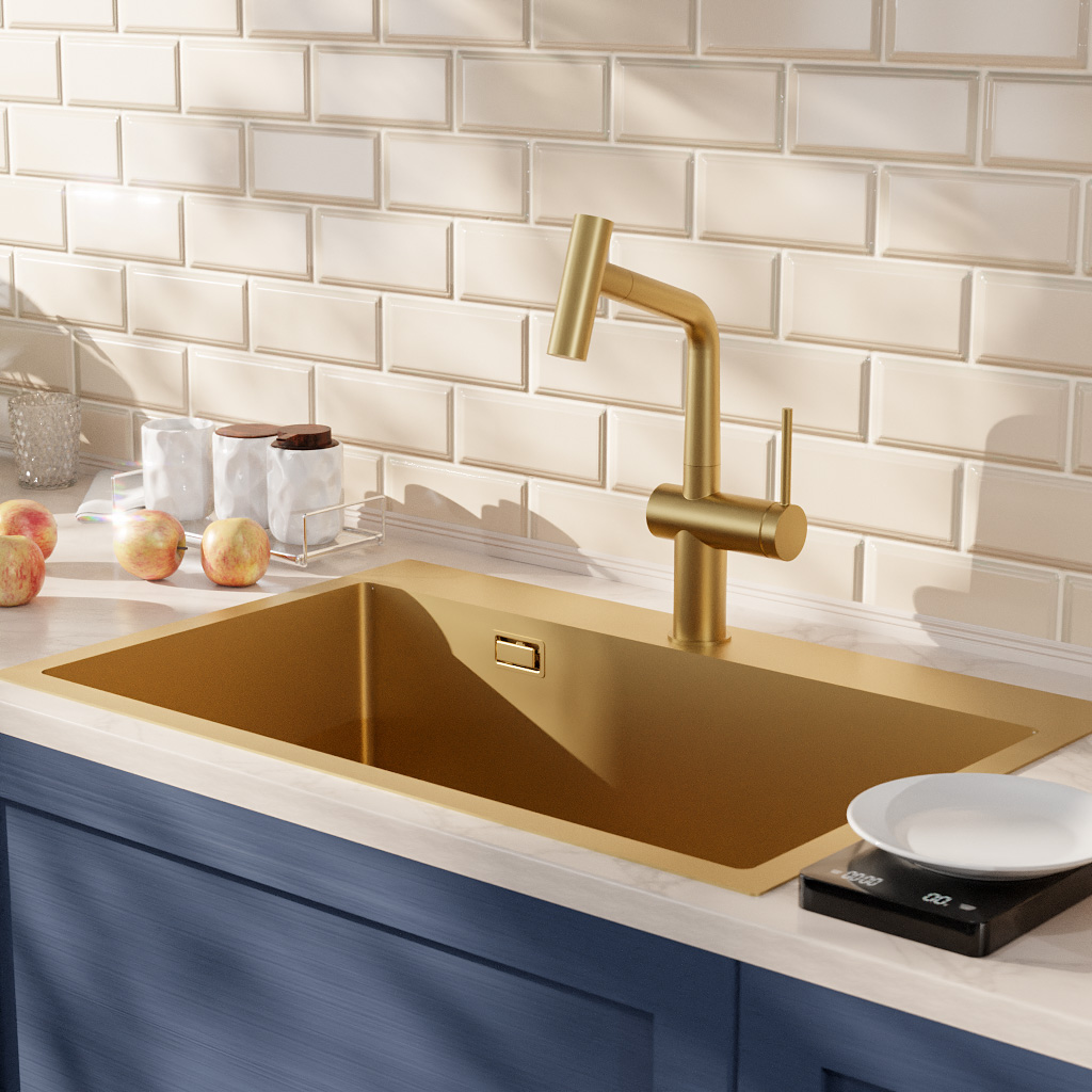 Caractéristiques de l'évier de cuisine encastrable 68x45x21 cm en inox 304, 1 bac + mitigeur d'évier à levier en acier inoxydable avec douchette extractible, monotrou, Ceramia Timeless, or brossé (TMLKST-6845BG-M1) :