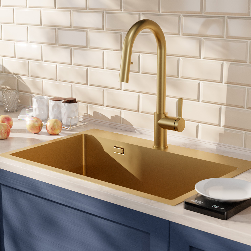 Caractéristiques de l'évier encastrable 68x45x21 cm en inox 304, 1 bac + mitigeur d'évier à levier en acier inoxydable avec douchette extractible, monotrou, Ceramia Timeless, or brossé (TMLKST-6845BG-M2) :