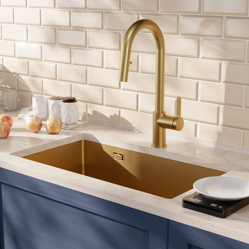 Ceramia Timeless 68x45x21 cm évier sous plan en inox 304 + mitigeur inox avec douchette extractible, or brossé (TMLKSU-6845BG-M2)