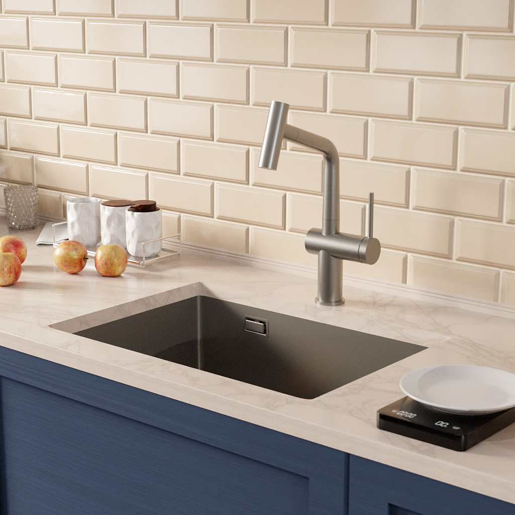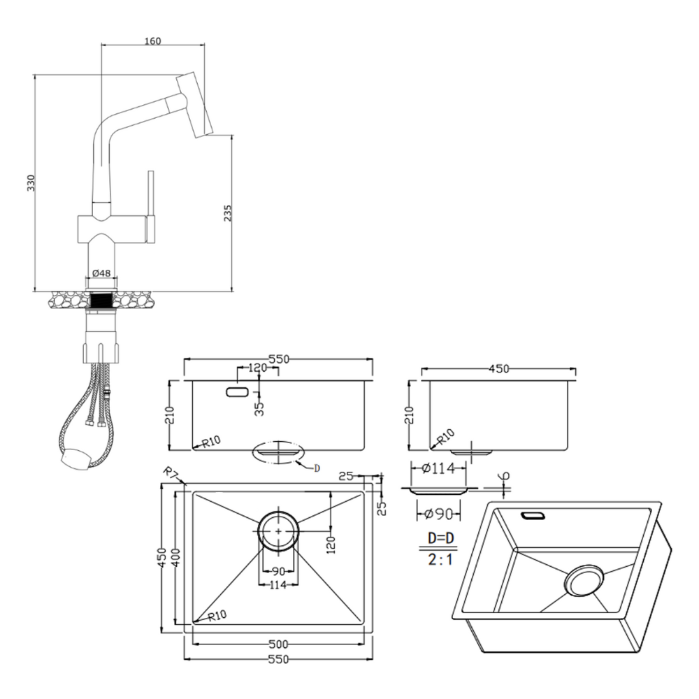 Caractéristiques de l'évier de cuisine sous plan 55x45x21 cm en inox 304, 1 bac + mitigeur d'évier à levier en acier inoxydable avec douchette extractible, monotrou, Ceramia Timeless, gun metal brossé (TMLKSU-5545BGM-M1) :
