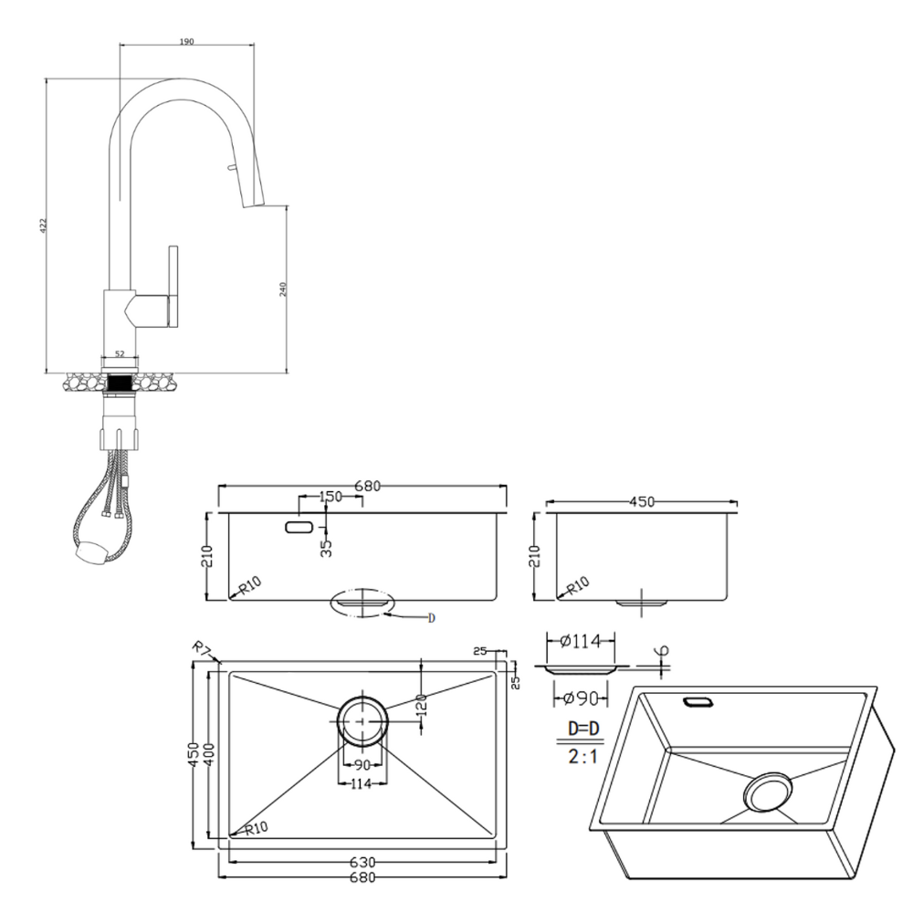 Caractéristiques de l'évier de cuisine sous plan 68x45x21 cm en inox 304 + mitigeur d'évier à levier en acier inoxydable avec douchette extractible, monotrou, Ceramia Timeless, gun metal brossé (TMLKSU-6845BGM-M2) :