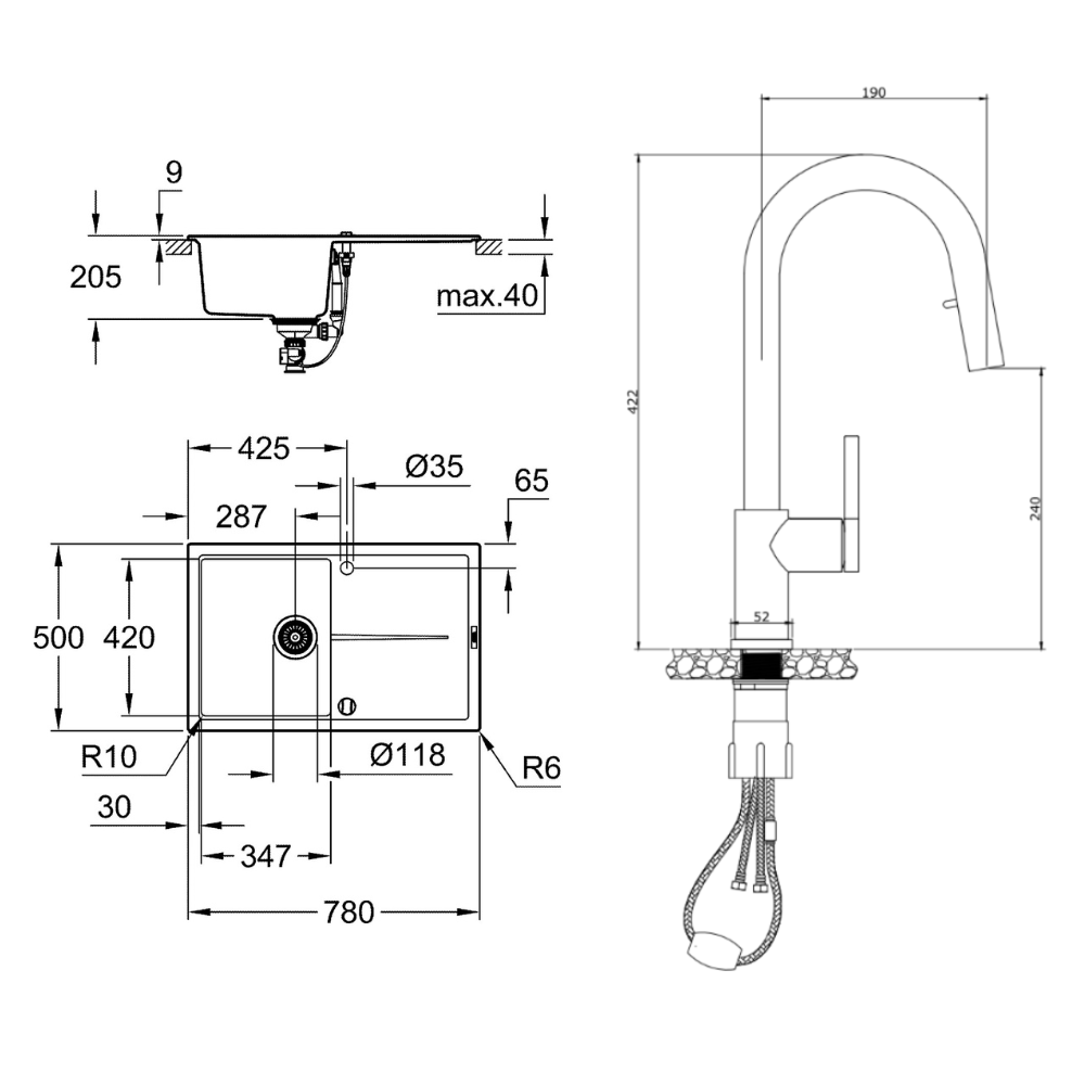 Caractéristiques de l'évier en quartz composite avec égouttoir réversible 780x500 mm Grohe K400 + Ceramia Timeless mitigeur (G31639TML2BM-SET) :