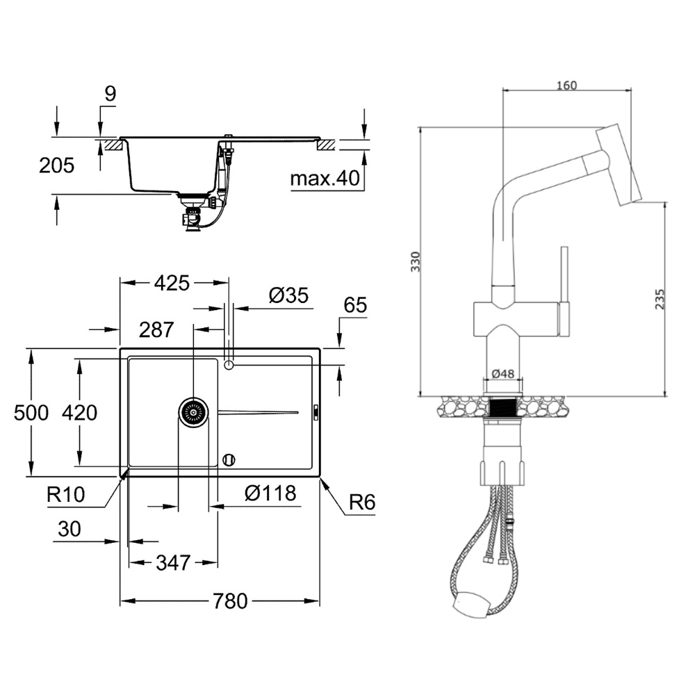 Caractéristiques de l'évier en quartz composite avec égouttoir réversible 780x500 mm Grohe K400 + Ceramia Timeless mitigeur (G31639TML1BM-SET) :