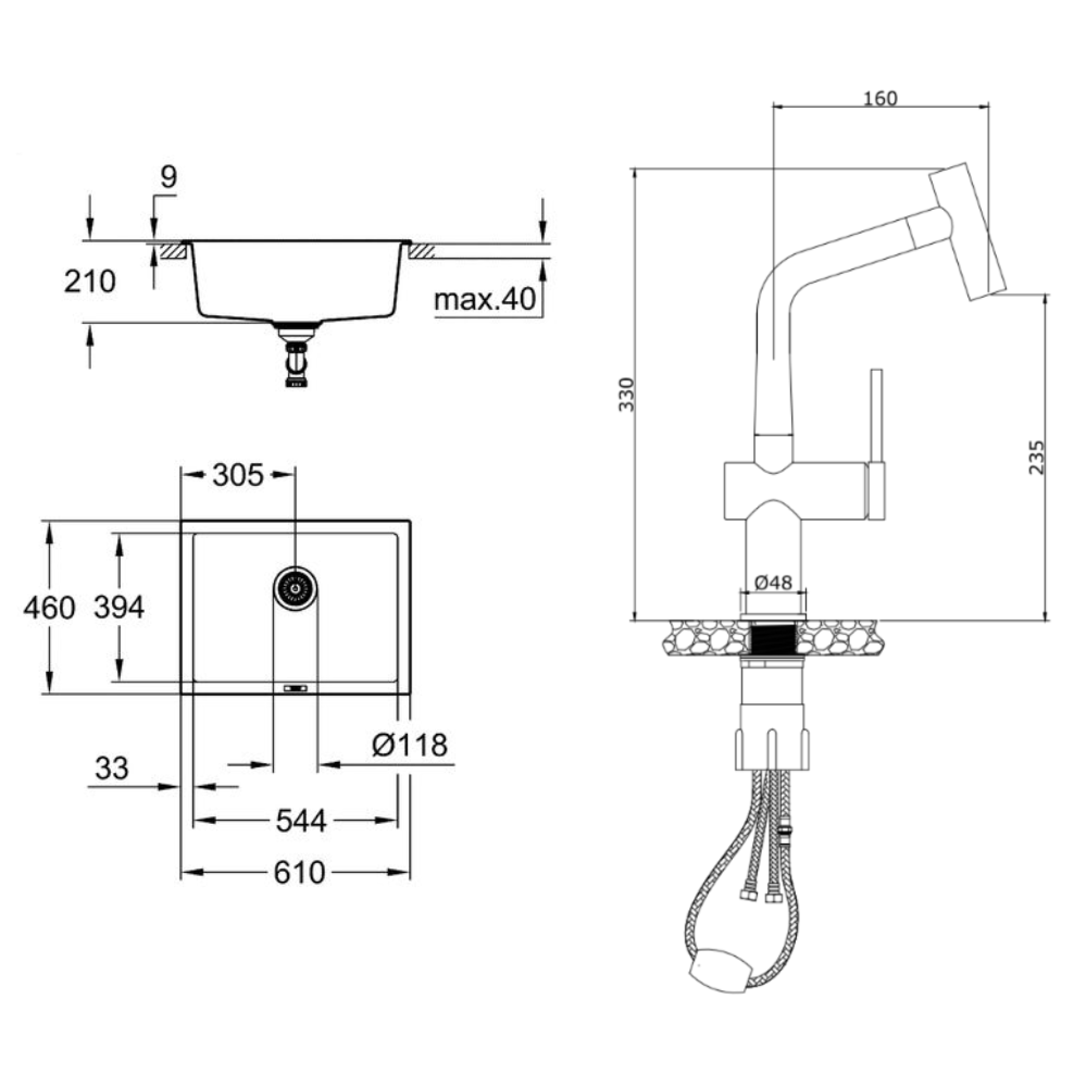Caractéristiques de l'évier composite Grohe K700U + Ceramia Timeless mitigeur (G31655TML1BG-SET) :