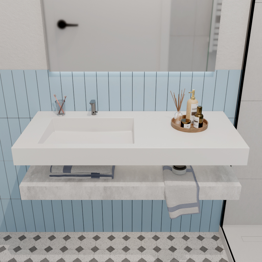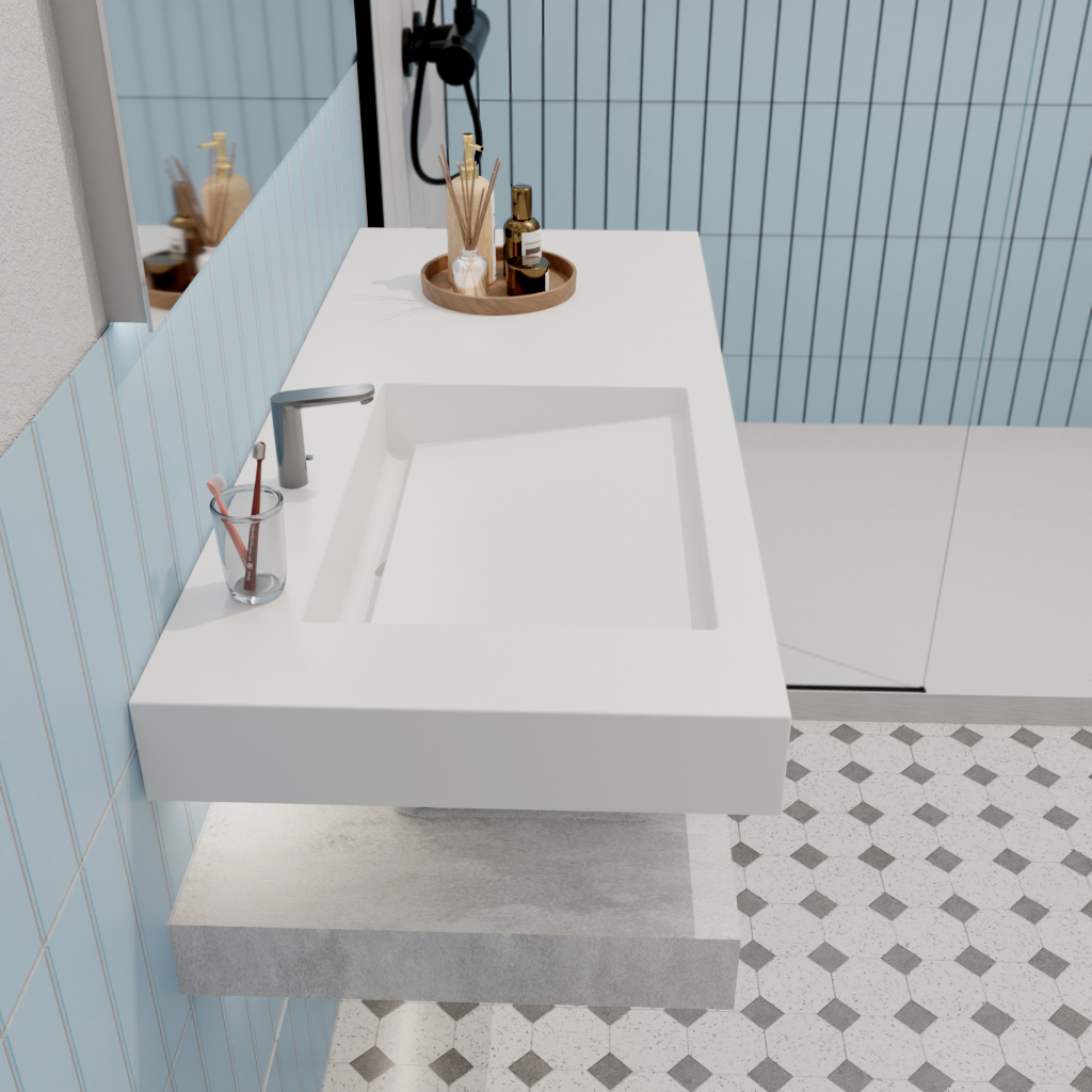 - Monobloc : Surface lisse en Solid Surface, sans joint visible et non poreuse.