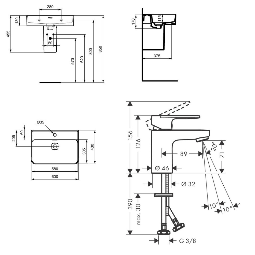 Strada II Caractéristiques du lavabo 600x430 mm 1 trou Ideal Standard Strada II + Hansgrohe Vernis Blend mitigeur lavabo, avec cartouche en céramique, sans tirette ni vidage (T300001HG71558000) :