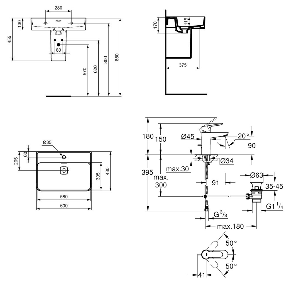 Caractéristiques du lavabo 600x430 mm 1 trou Ideal Standard Strada II + Grohe mitigeur monocommande lavabo taille S, chrome (T300001G23328000) :