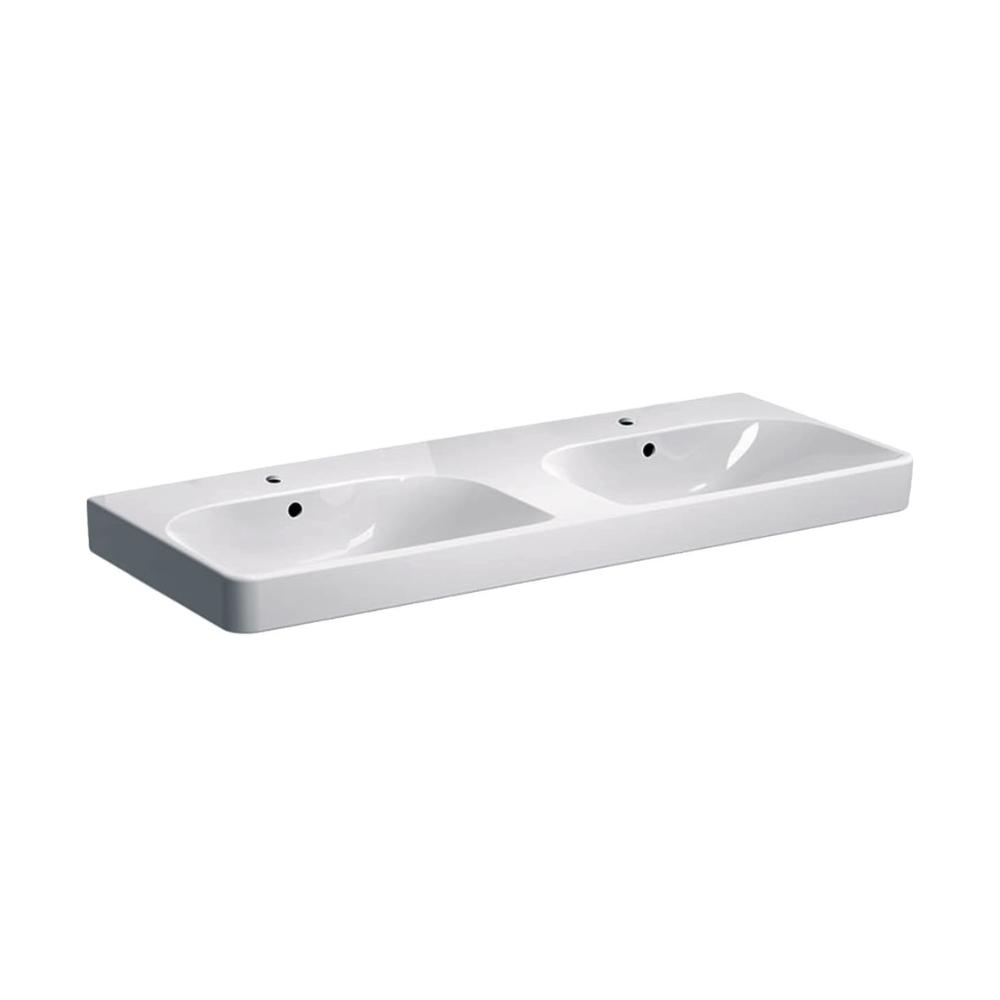 Geberit Smyle Square 120x48x16,5 cm lavabo double vasque céramique, 2 trous de robinetterie au milieu, trop-plein, blanc (500.223.01.1)