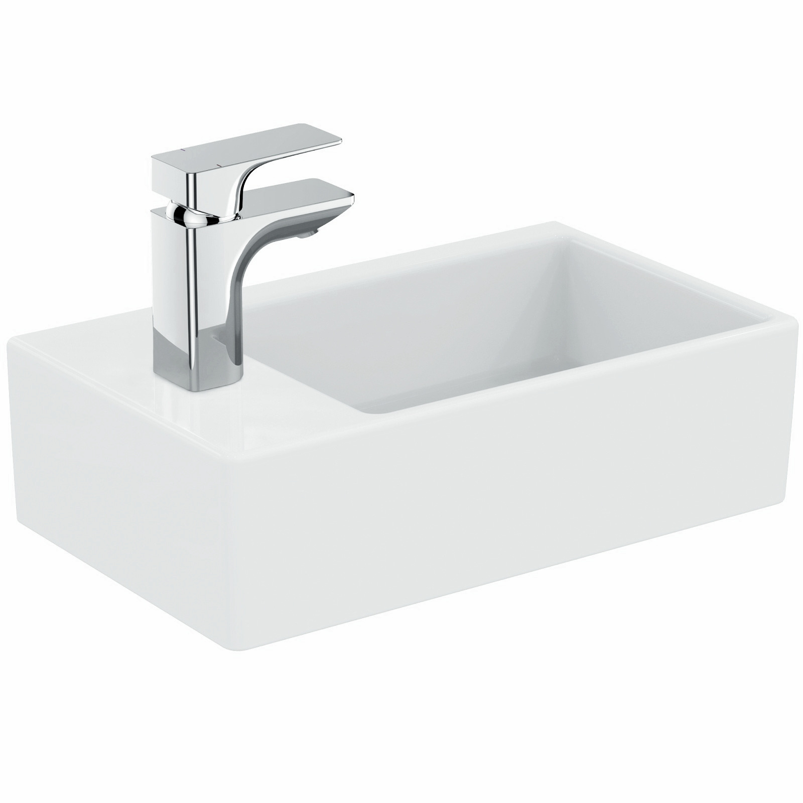 - Lave-mains de forme rectangulaire avec une plage arrière plane équipée d'un trou de robinetterie à gauche.