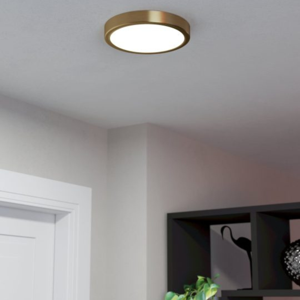 Le plafonnier LED Eglo série Fueva, en saillie avec une jolie bordure de couleur or, pour une lumière de qualité et pleine de style.