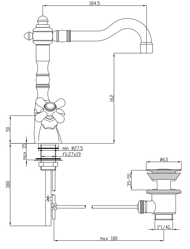 Caractéristiques du Mélangeur XL de lavabo avec tirette et bonde, Design vintage, Bronze, Paffoni Ricordi (IR085BR) :