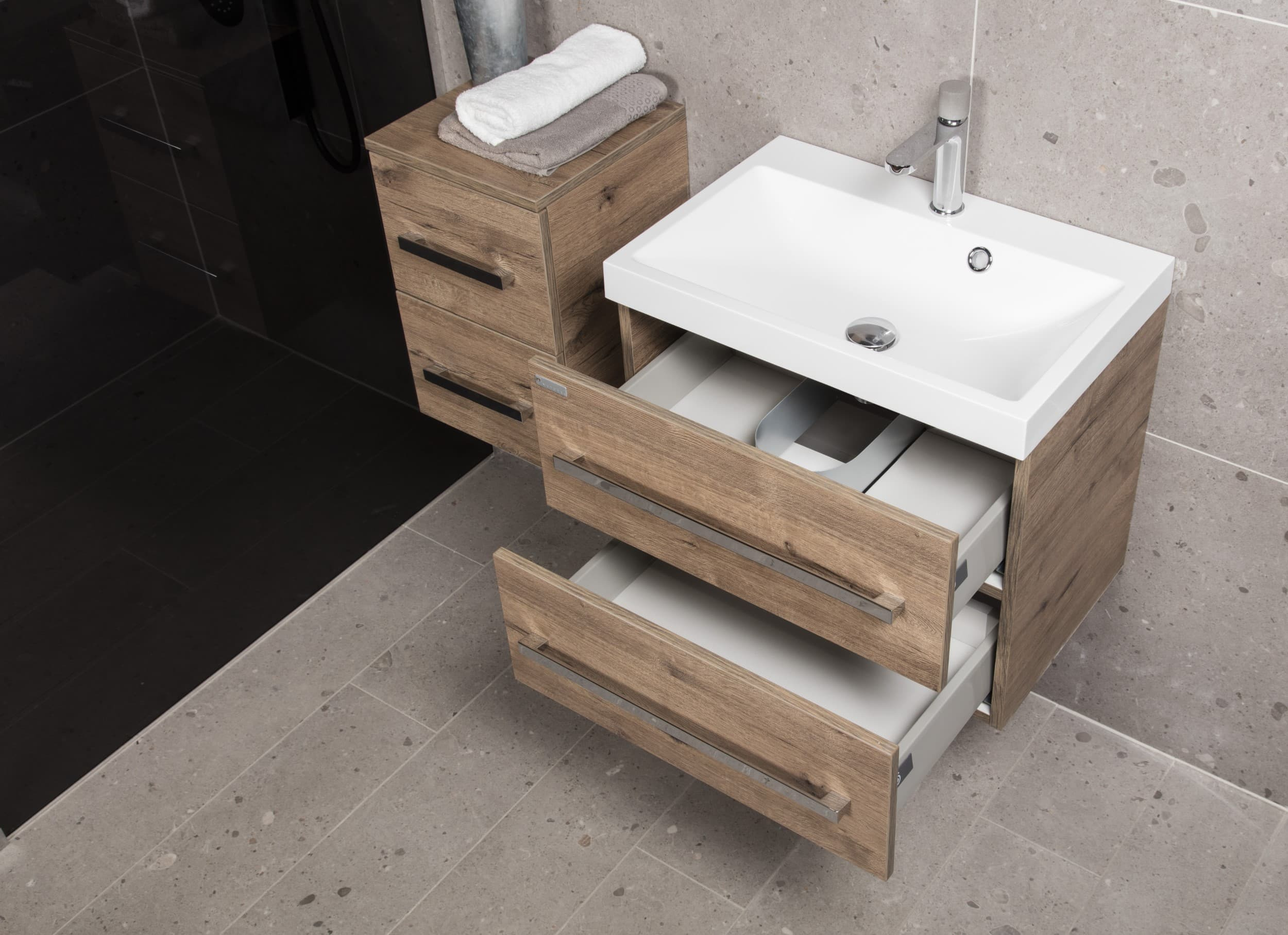 Meuble bas pratique pour la salle de bain avec deux tiroirs qui offrent un espace de rangement pour vos accessoires d'hygiène. Les tiroirs ont une extension totale avec butée.