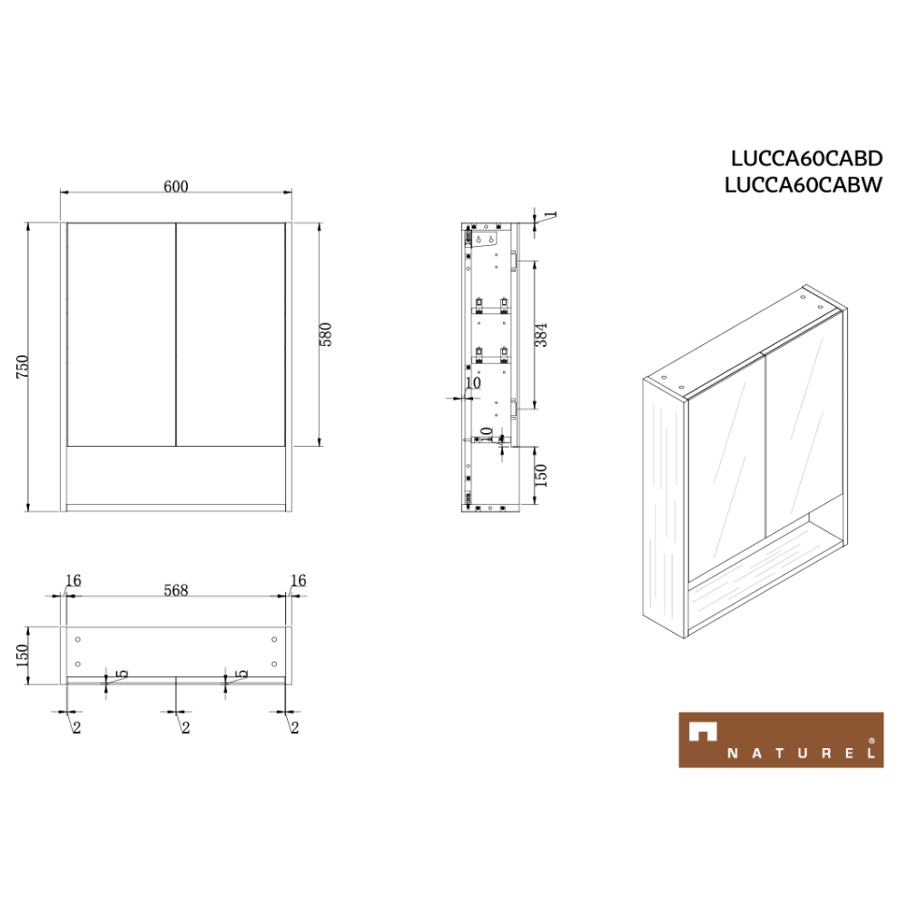 Caractéristiques de l'armoire de toilette assemblée 60x75 cm, stratifié, 4 étagères, miroir, couleur chêne, Naturel Lucca (LUCCA60CABD) :