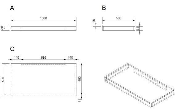 Plaque sous le lavabo. Le trou pour le vidage du lavabo doit être réalisé en fonction de la cuvette achetée. Les supports pour accrocher la planche au mur ne sont pas inclus dans la livraison.