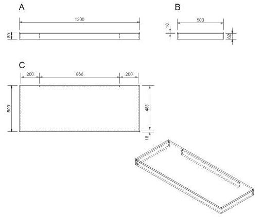 Plaque sous le lavabo. Le trou pour le vidage du lavabo doit être réalisé en fonction de la cuvette achetée. Les supports pour accrocher la planche au mur ne sont pas inclus dans la livraison. Les supports appropriés sont KONZOLEH et KONZOLEP.