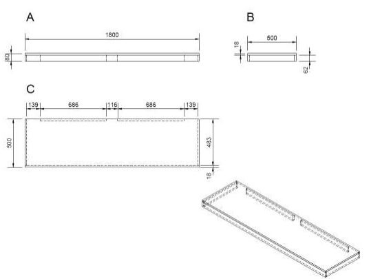 Plaque sous le lavabo. Le trou pour le vidage du lavabo doit être réalisé en fonction de la cuvette achetée. Les supports pour accrocher la planche au mur ne sont pas inclus dans la livraison