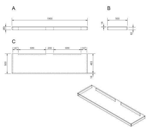 Plaque sous le lavabo. Le trou pour le vidage du lavabo doit être réalisé en fonction de la cuvette achetée. Les supports pour accrocher la planche au mur ne sont pas inclus dans la livraison
