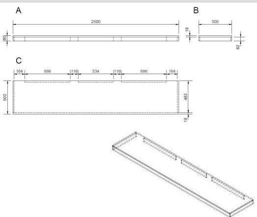 Plaque sous le lavabo. Le trou pour le vidage du lavabo doit être réalisé en fonction de la cuvette achetée. Les supports pour accrocher la planche au mur ne sont pas inclus dans la livraison. Les supports appropriés sont KONZOLEH et KONZOLEP.