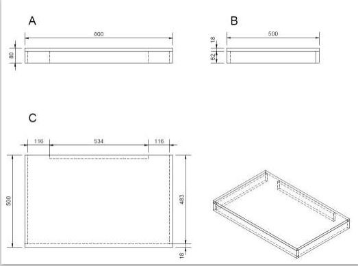 Plaque sous le lavabo. Le trou pour le vidage du lavabo doit être réalisé en fonction de la cuvette achetée. Les supports pour accrocher la planche au mur ne sont pas inclus dans la livraison