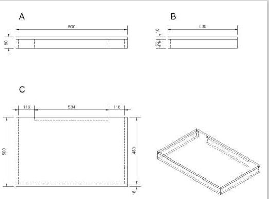 Plaque sous le lavabo. Le trou pour le vidage du lavabo doit être réalisé en fonction de la cuvette achetée. Les supports pour accrocher la planche au mur ne sont pas inclus dans la livraison. Les supports appropriés sont KONZOLEH et KONZOLEP.