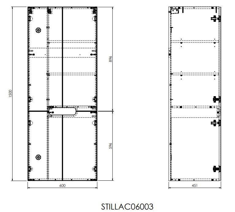 Armoire murale STILLAC06003 avec portes équipées d'un système de fermeture silencieuse. La porte peut être montée pour s'ouvrir à droite ou à gauche. Derrière la poignée fraisée se trouve une plaque distinctive qui souligne le caractère unique.